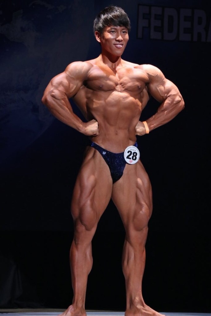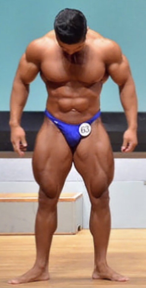 このポージングだと、大胸筋の厚みより広背筋にポイントは移行し、視点が上から下へ向きそうです。